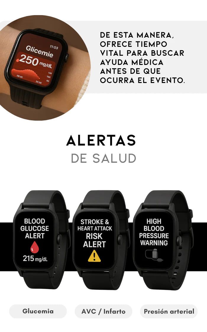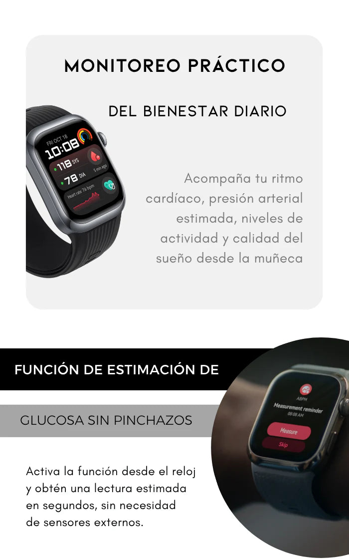Para aprovechar todas las funciones del reloj, incluyendo el monitoreo de glucosa, puede ser necesario descargar una aplicación compatible. Esta información específica y los enlaces de descarga están disponibles en el manual del usuario.